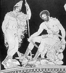Odiseo en la majada de Eumeo. Odiseo no revela su verdadera identidad a Eumeo, quien lo recibe con comida y manta. Se encuentra con la diosa Atenea, y juntos preparan la venganza contra los pretendientes.
